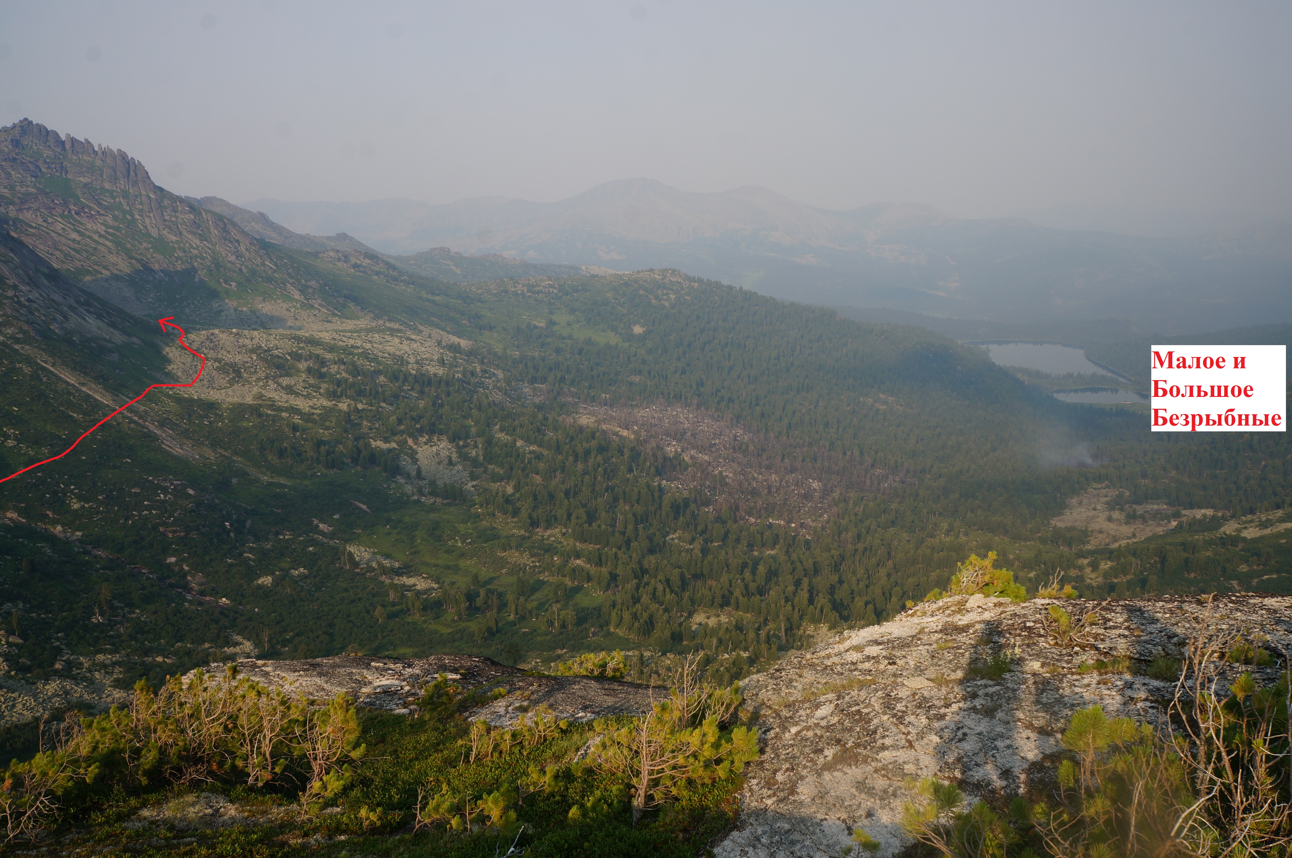 Встали лагерем у озера Малахитовое к обеду. Из-за сильной задымлённости решили посмотреть с перевала Зелёный в сторону озёр Малое и Большое Безрыбное. Один очаг уже выгорел, а другой был ещё дальше от нашего маршрута. Решили продолжить маршрут на следующий день.