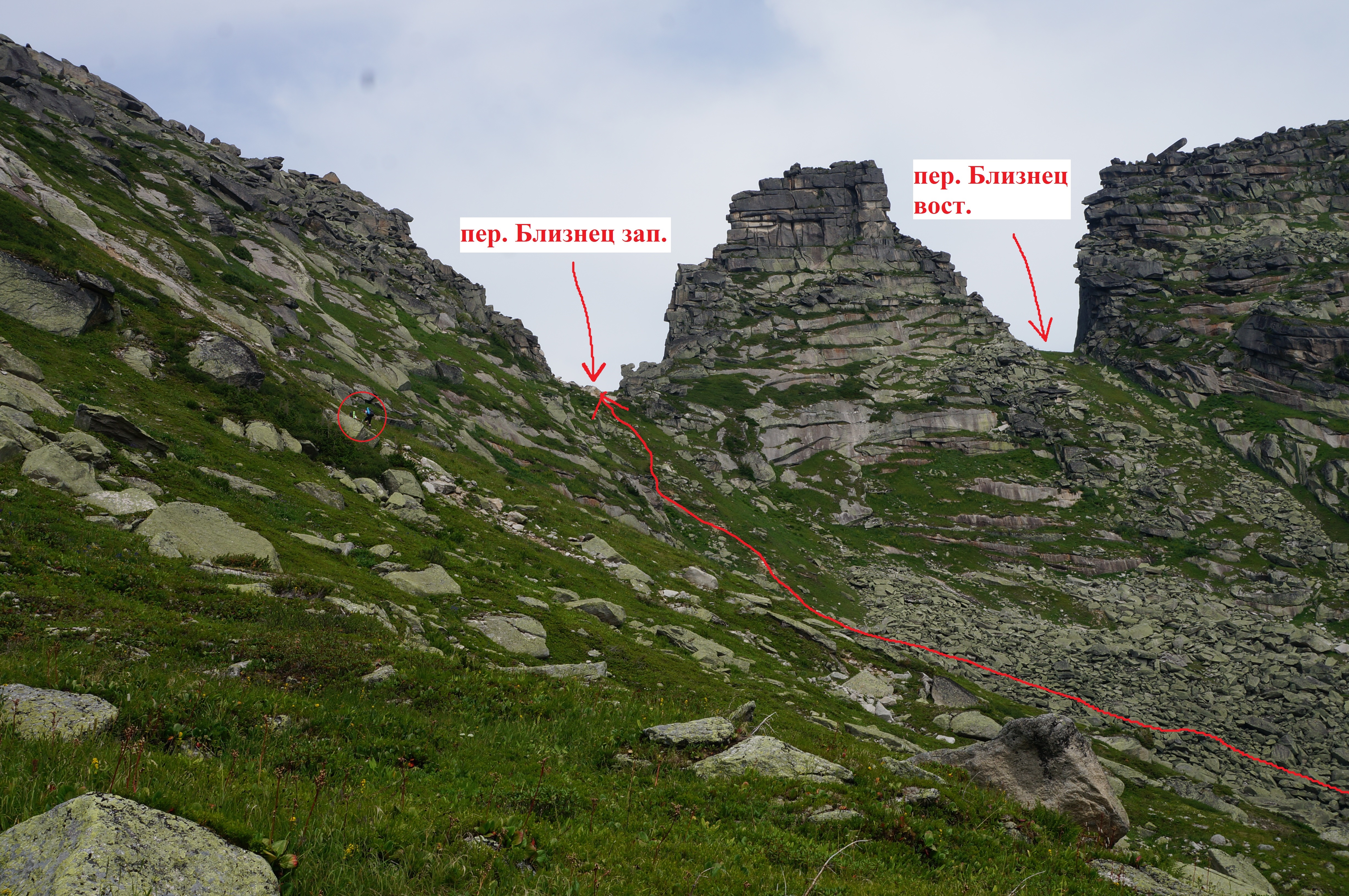 Люди в кружочке пошли по южному склону перевала Близнец западный радиально без тропы. Красная линия - примерная тропа.