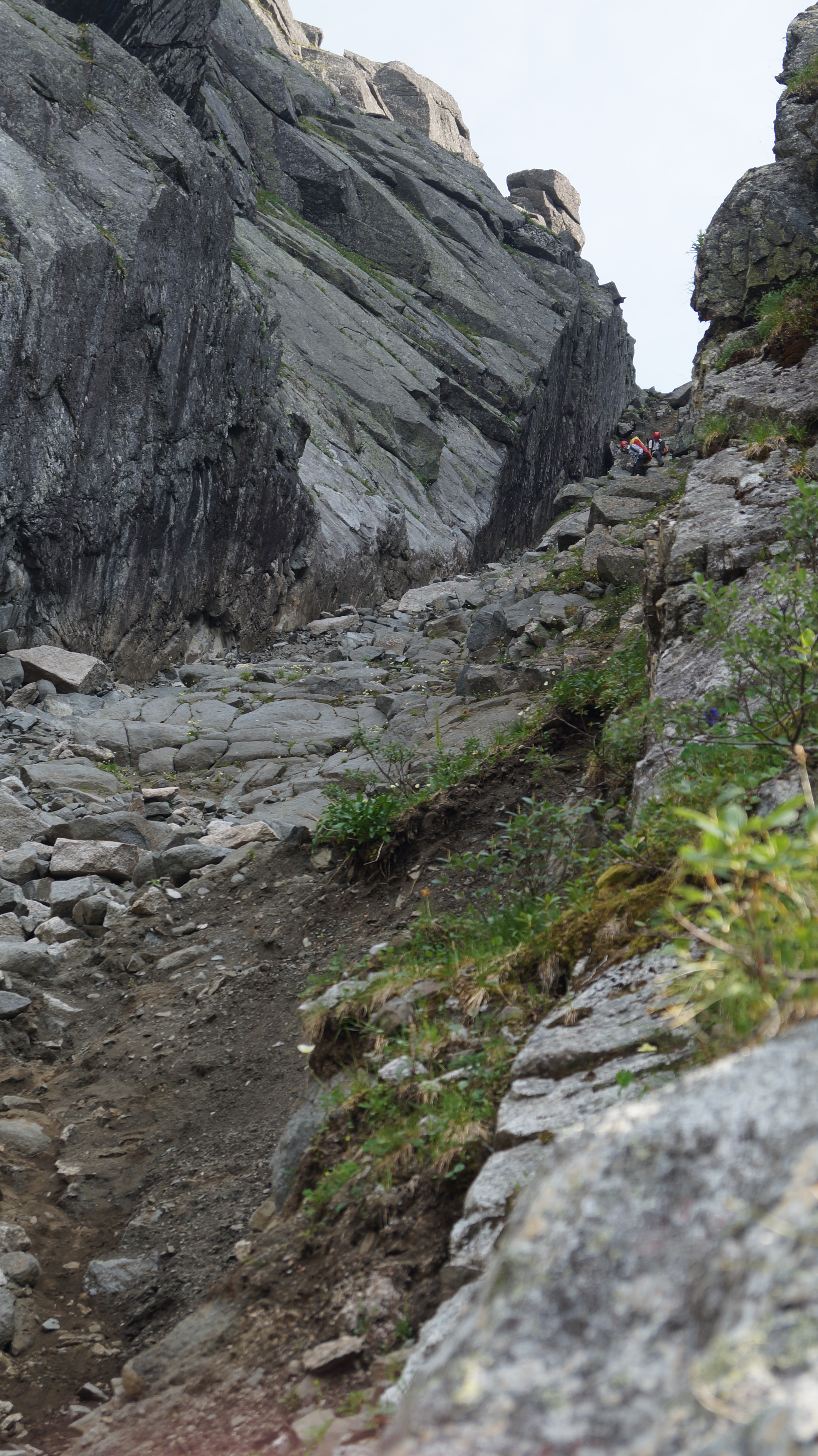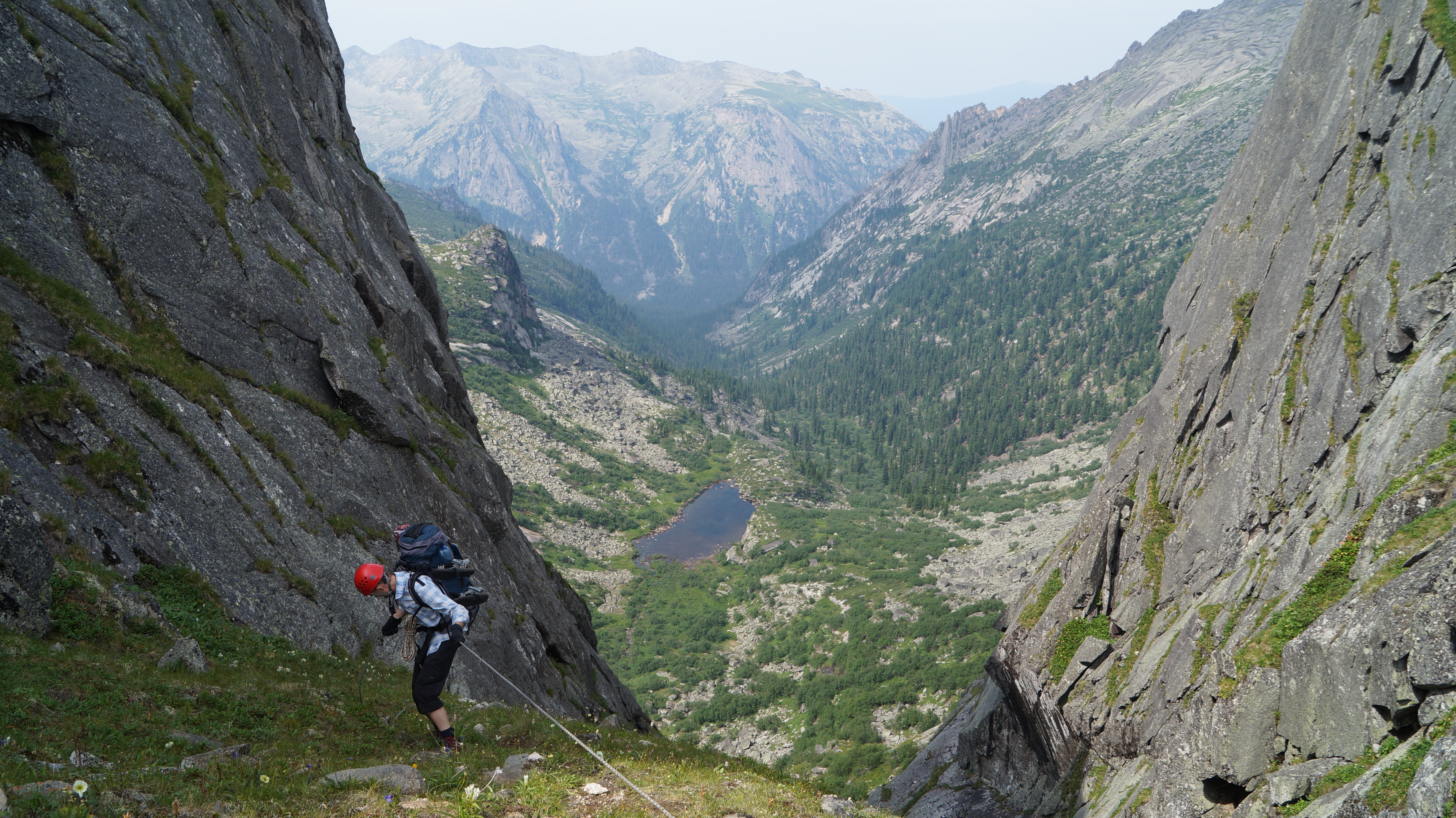 Северная сторона перевала Близнец западный (1Б). Для нас это был спуск без использования верёвки, поэтому потратили мы много времени и сил. Сложность: крутой склон (близко к 40°), нет явной тропы, ступеньки местами в половину роста (опять же с рюкзаками задача значительно усложняется, так как прыгать не получится), сыплются камни и чем ниже и правее, тем чаще.