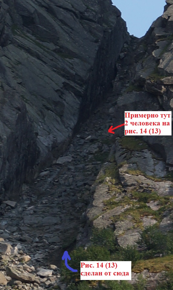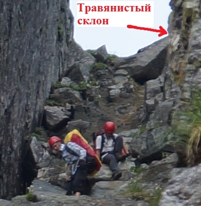 Есть другой вариант - справа (по рисунку 12) от скально-травянистого склона есть обрывистый, скальный, сыпучий, по нему без верёвки уравновешенный человек спускаться не станет. На рисунке 13 виден этот участок и видно положение, в котором приходится спускаться во многих местах. Но самая тяжёлая часть скрыта за скалой.